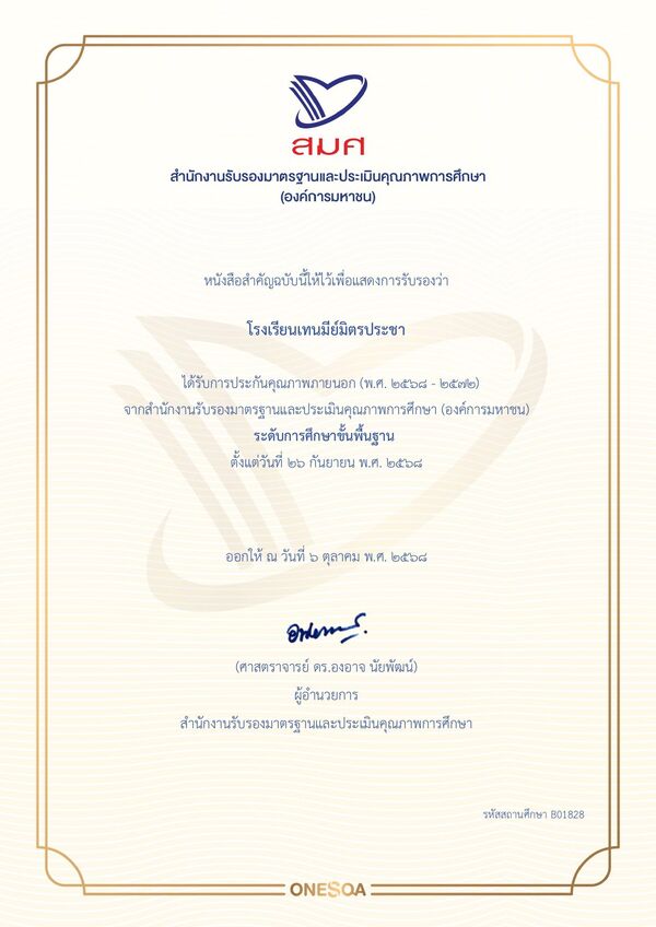 โรงเรียนเทนมีย์มิตรประชา ผ่านการรับรองการประเมินคุณภาพภายนอกรอบ 5 ของสำนักงานรับรองมาตรฐานและประเมินคุณภาพการศึกษา (สมศ.) ระดับการศึกษาขั้นพื้นฐาน